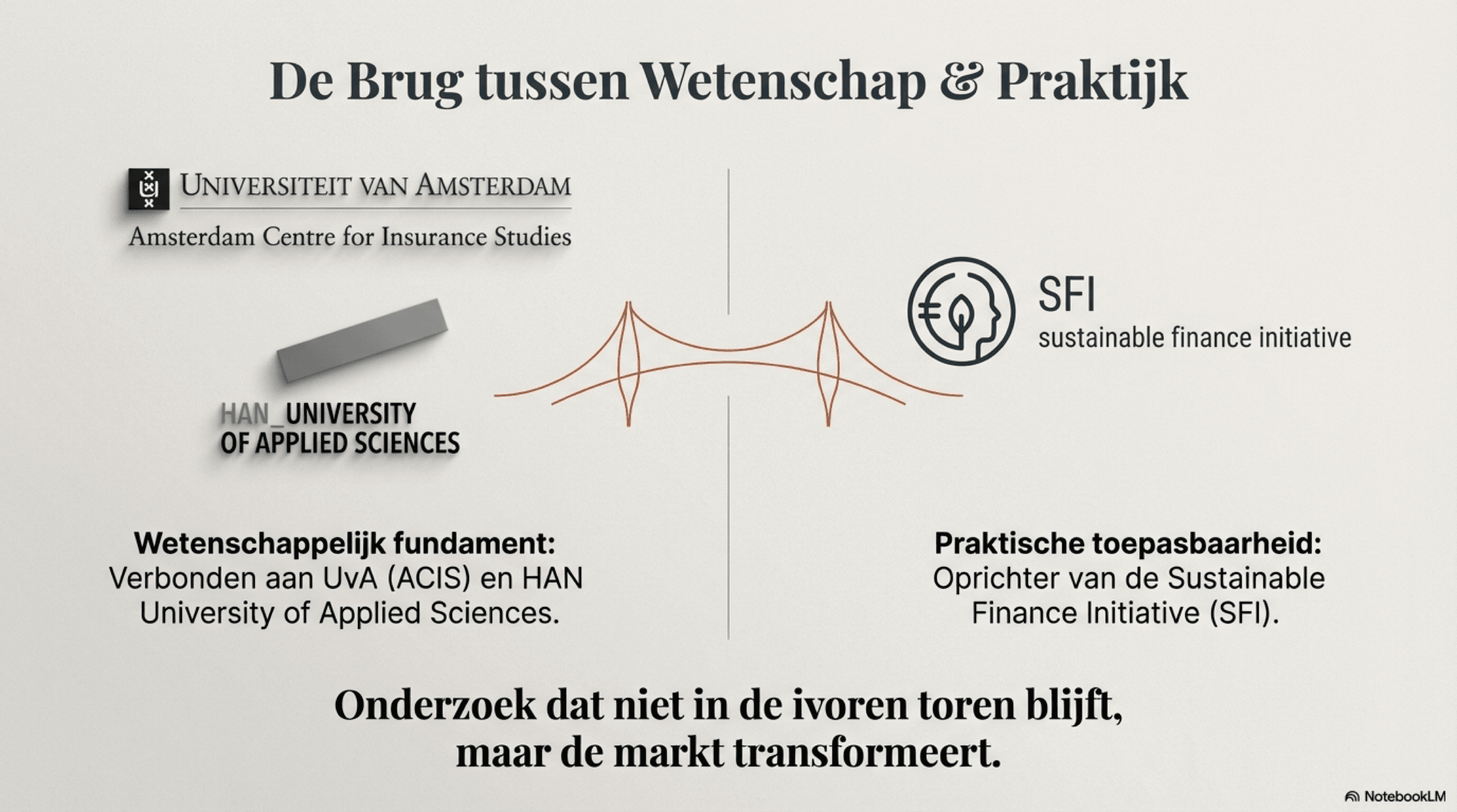 Het werk richt zich op onderzoek, analyse, advies en kennisdeling binnen de financieel adviesmarkt. Daarbij worden academische inzichten verbonden met vraagstukken uit de dagelijkse praktijk van financiële ondernemingen, met oog voor zowel structuur als nuance.